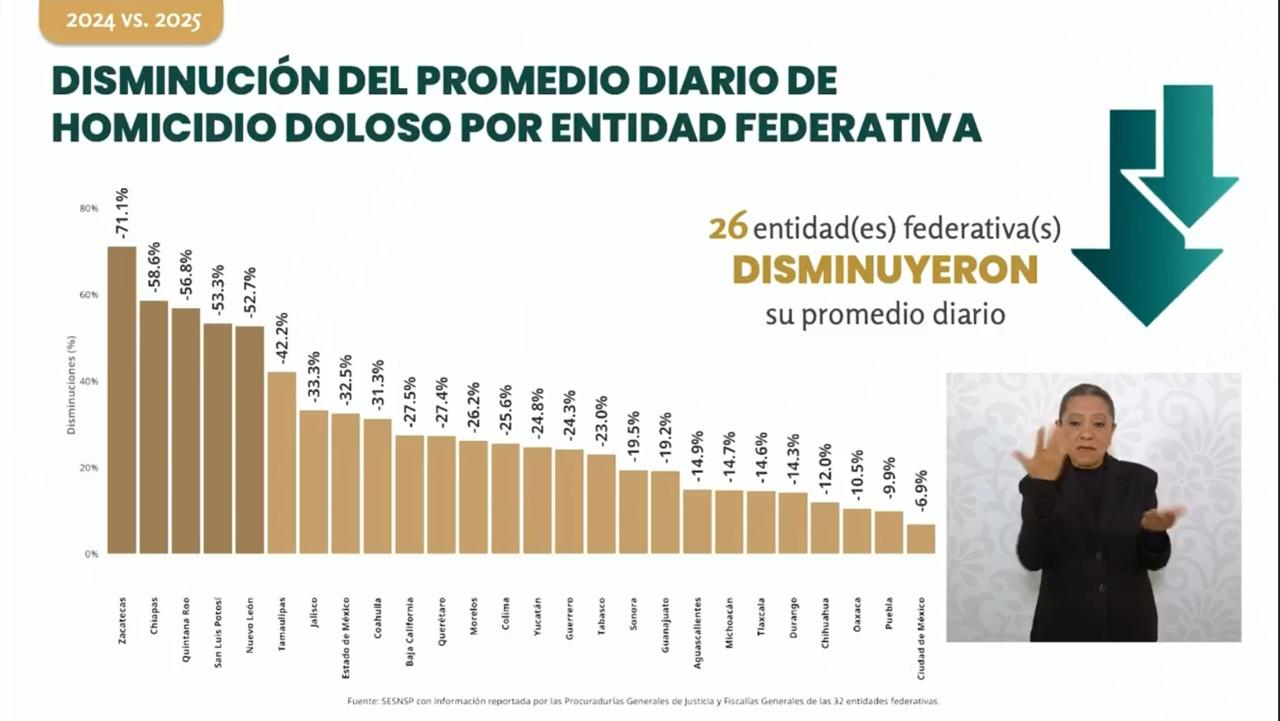 Por segundo año consecutivo, Zacatecas se consolida como el estado más seguro del país, al registrar una reducción histórica del 71.1 por ciento en homicidios dolosos entre 2024 y 2025. Así lo informó el gobernador David Monreal Ávila, con base en los datos más recientes del Secretariado Ejecutivo del Sistema Nacional de Seguridad Pública (SESNSP), presentados durante la conferencia presidencial “La Mañanera del Pueblo”, encabezada por la presidenta de México, Claudia Sheinbaum Pardo.